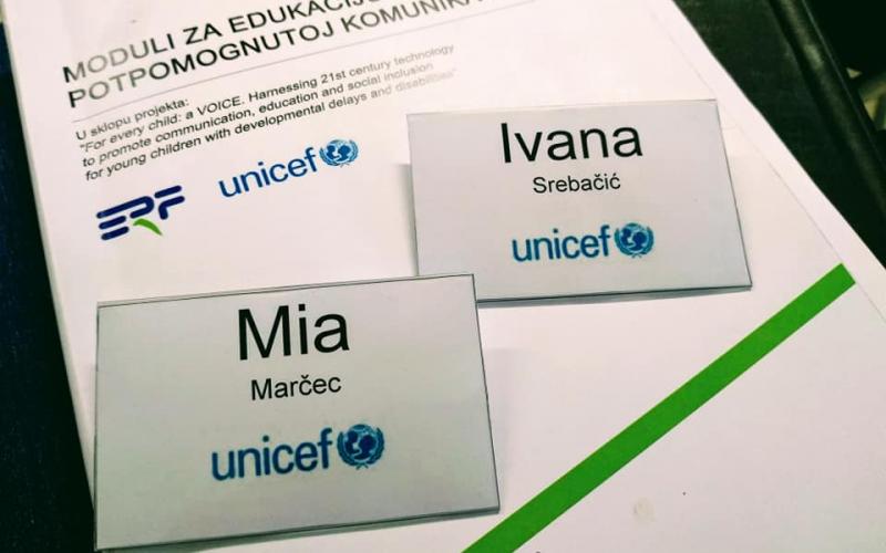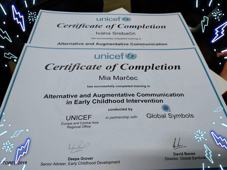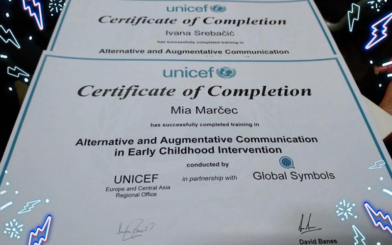 Ivana Srebačić i Mia Marčec završile su edukaciju u sklopu projekta Komunikacija za svako dijete - primjena tehnologije 21. stoljeća za promociju komunikacije, obrazovanja i socijalnog uključivanja djece rane dobi s teškoćama u razvoju. Provele su nekoliko intenzivnih dana slušajući, raspravljajući i aktivno sudjelujući u aktivnostima povezanima uz potpomognutu komunikaciju. Hvala predavačima: Ana-Mariji Bohaček, Davidu Banesu i EA Draffan. U sklopu projekta, URIVŽ je dobila vrijednu donaciju uređaja za potpomognutu komunikaciju.